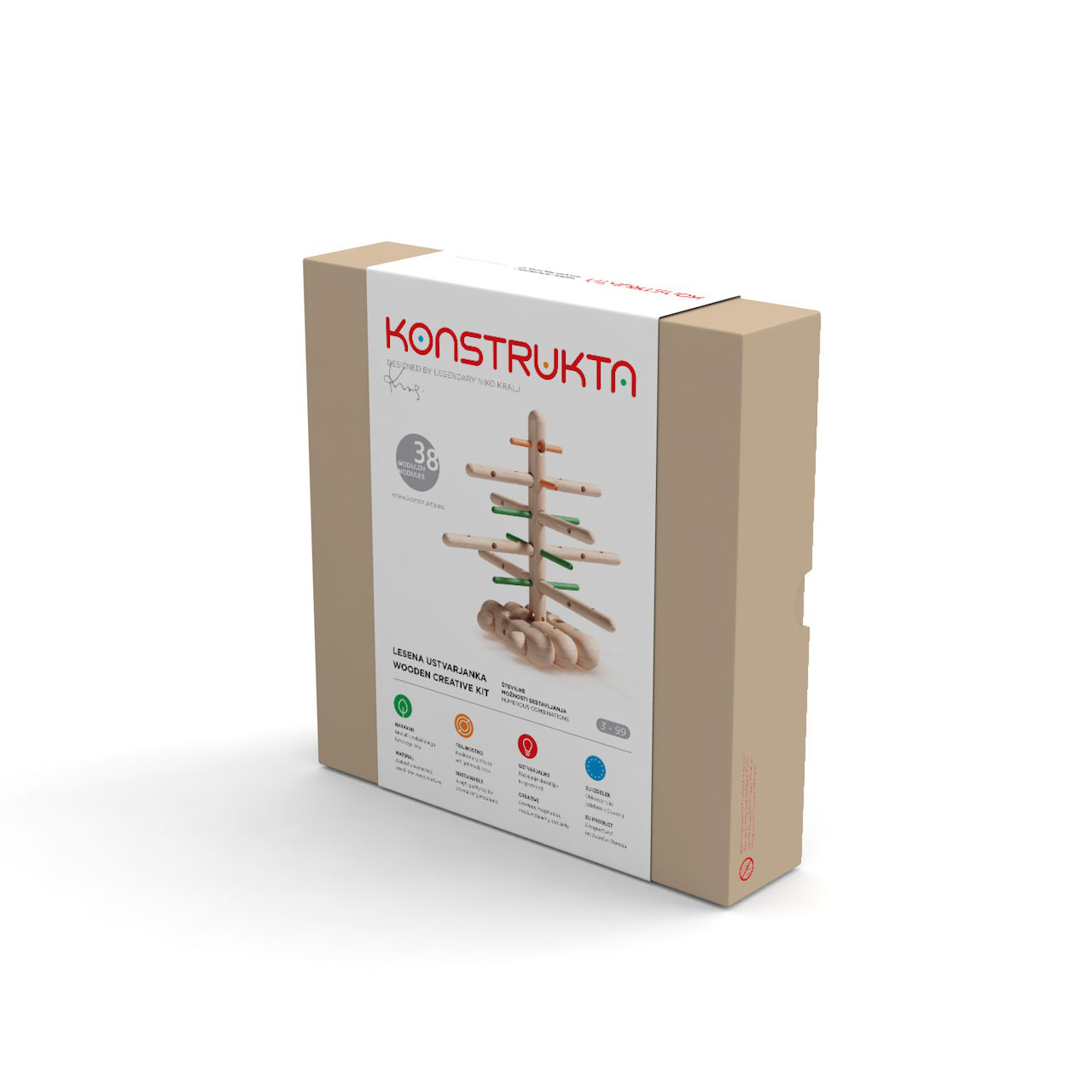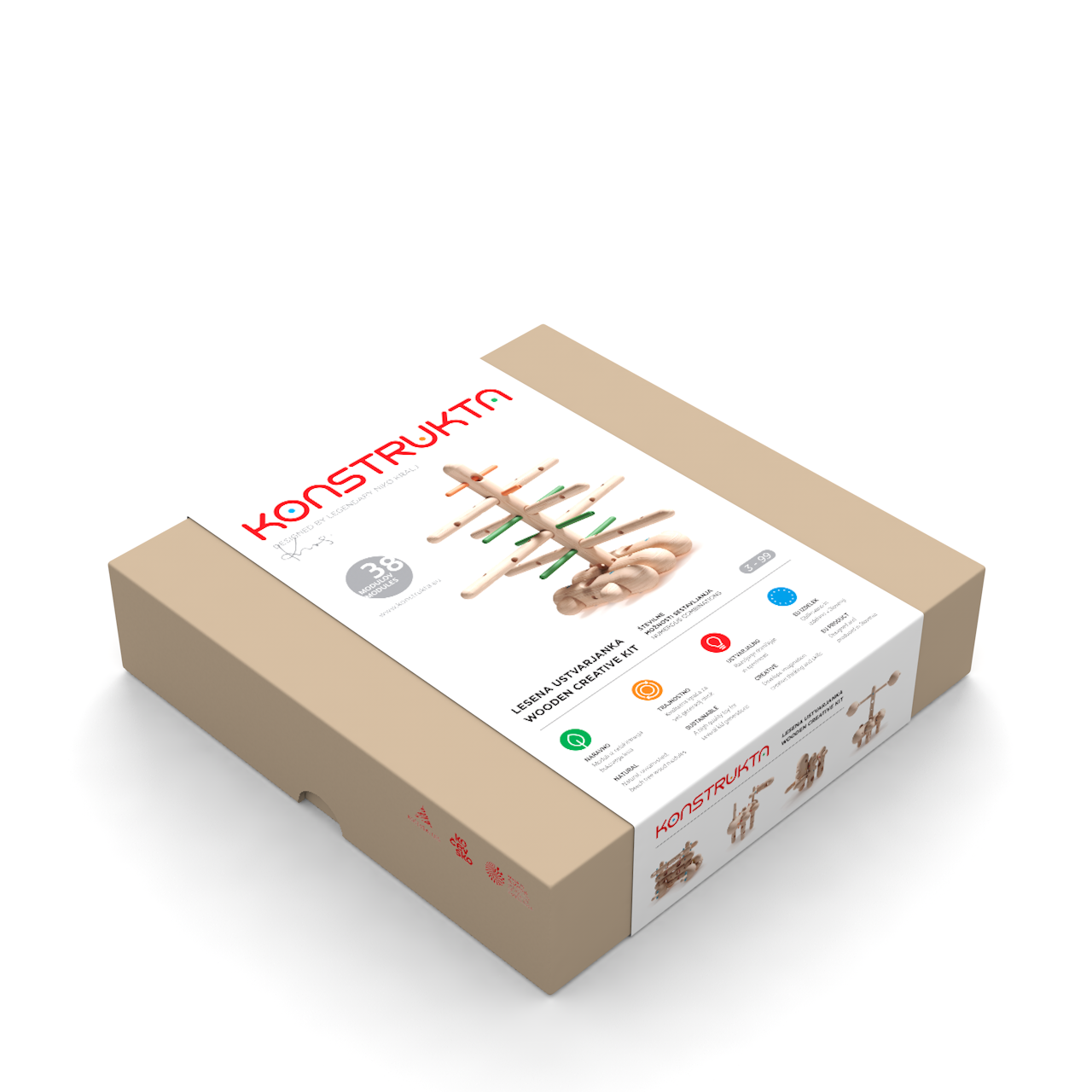 Konstrukta is a sustainable product because it is made from local wood and does not contain any additional unnatural ingredients that would affect sustainability. The product is free from coatings and adhesives. On the other hand, the toy is designed to last for multiple generations and can be passed down from one family member to another. Despite its age, the toy will remain relevant, unique, and a challenge for new generations of children in creative play, which develops manual and cognitive skills, independent thinking, teamwork, and an interest in science and technology, making it a STEM (science, technology, engineering, and mathematics) toy.