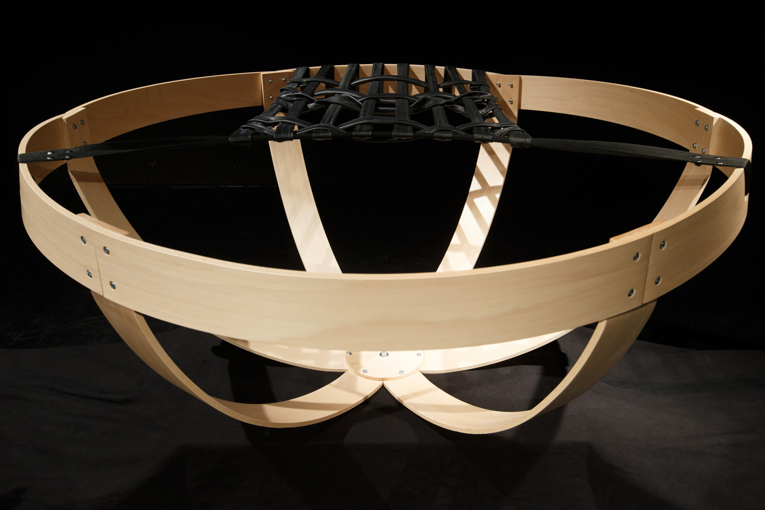 The Ziba recliner, constructed from curved plywood, oak seat and backrest elements, and strips of recycled rubber (or other recycled elastic material), symbolizes an island and a corner where the user can take a break. It's a sort of cradle for the adult. It represents a modern interpretation of a cradle and an artificially assembled human nest, which is both comfortable and unique. The recliner emphasizes the warmth and homeliness of wood, as we touch wood wherever we come into contact with it. Privacy is also emphasized in the recliner, as we are in a sort of divided space defined by a circle. The recliner provides the user with various sitting positions while ensuring that even when resting, we make small movements, sway, and in a way, "float" embraced by the wooden support. This maintains better circulation throughout the body, relieving the body alternately and as evenly as possible. Therefore, the recliner is more attractive, interesting, and more ergonomic than recliners designed only as deep seats or as beds. We control our own balance, so we are not entirely passive in our rest, thus avoiding discomfort. The seat and backrest are designed to provide support on the left and right sides, while the spine remains relatively free, avoiding pressure on the recliner with exposed bone areas.