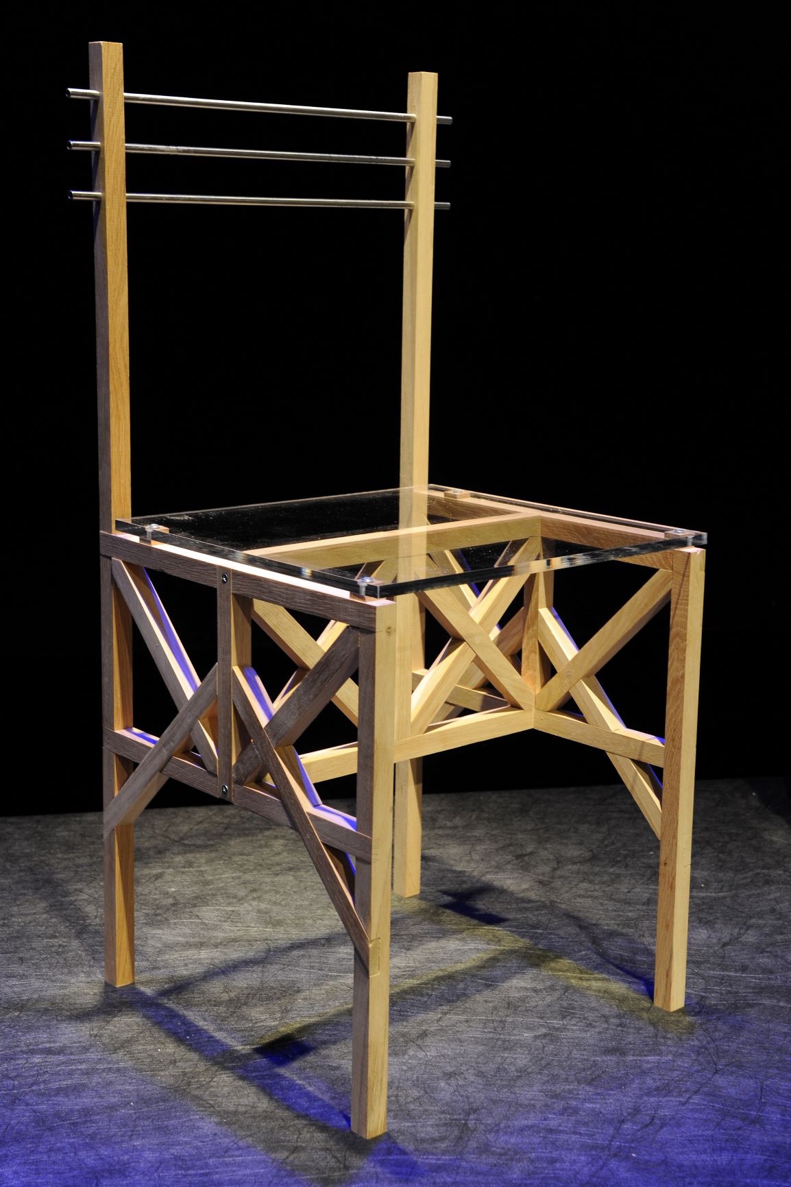 The chair is designed as a blend of traditional and modern materials. With this in mind, I also chose the name PRAMOD(ern) CHAIR. I approached the design with the intention of creating a modern chair with a streamlined construction that consists only of the essential elements necessary for existence. When I arrived at the final shape, I realized that two sections of the chair were remarkably similar in shape, differing only in dimensions. The first section consists of the front legs, armrests, and backrest. The second section comprises the sides of the seat, rear legs, and connector between the legs. Upon realizing this, I decided that the seat should not stand out and detract attention from the construction. Therefore, the chair is composed of two materials: the frame is made of solid oak wood, finished with a technique of oiling. The seat consists of eight rods made of epoxy resin, which is transparent. Epoxy resin has been appearing in unique furniture pieces for some years now, but (in my opinion) rarely in an interesting and intelligent way. Therefore, it was crucial for me that its use had significance and that, in combination with wood, it served it rather than dominated it. By being unobtrusive, it allows us to see the beauty of the wood even more clearly.