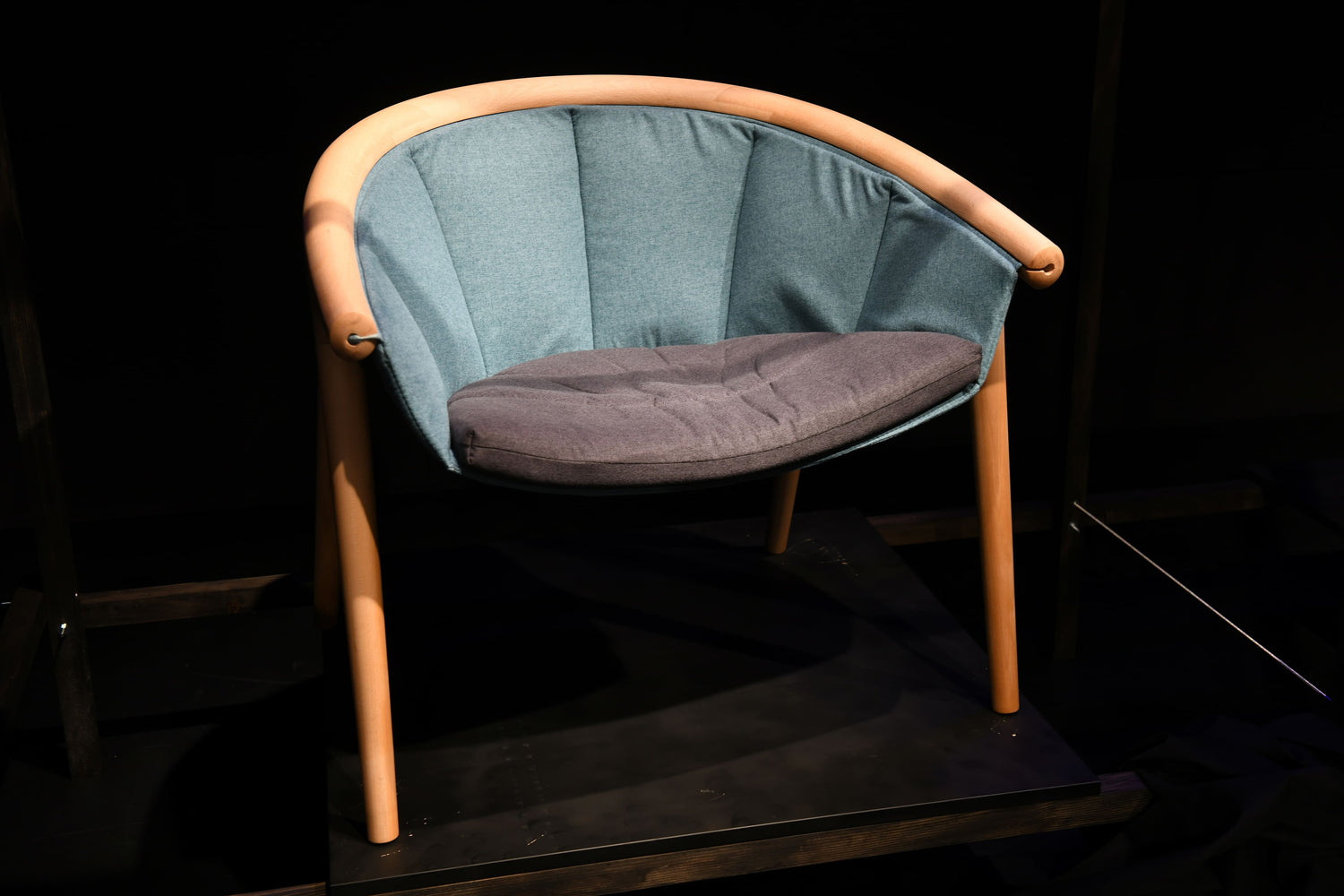 Evelyn is a armchair designed to redefine how we perceive seating furniture. The wooden structure is in constant dialogue with the fabric, which, like in a hammock, forms a suspended surface: this allows you to feel completely comfortable and surrounded. The almost perfect absence of contact with hard parts gives a pleasant feeling of lightness. The entire structure contains only five engineered or solid wood elements, machined with CNC milling and algorithmically optimized to provide maximum structural stability and minimal material consumption. The backrest features a continuous cutout containing a fabric guiding spiral, while the legs are attached with metal connections. The armchair exhibits a warm and contemporary appearance, while the interaction between the softness of the fabric and the sleekness of the structure provides an engaging and intriguing interplay of forces. Evelyn is designed to be completely disassembled into compact packaging.